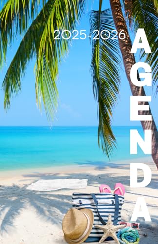 Agenda scolaire journalier 2025-2026-Thème vacances-Plage-Palmier-Sac de plage (12.85x19.84 cm) 1 page par jour