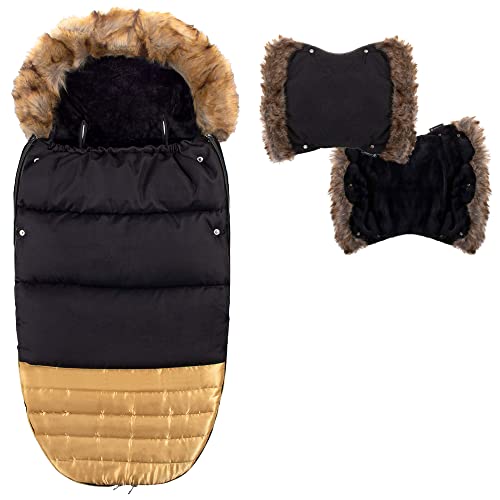 Fotmuff | Vintermuff | 90 x 45 cm | Päls med huva | Släde väska | Barnvagn | Släde | Ridning | Väderbeständig | Fodrad med flecee e Vår | Vinter (svart-guld)