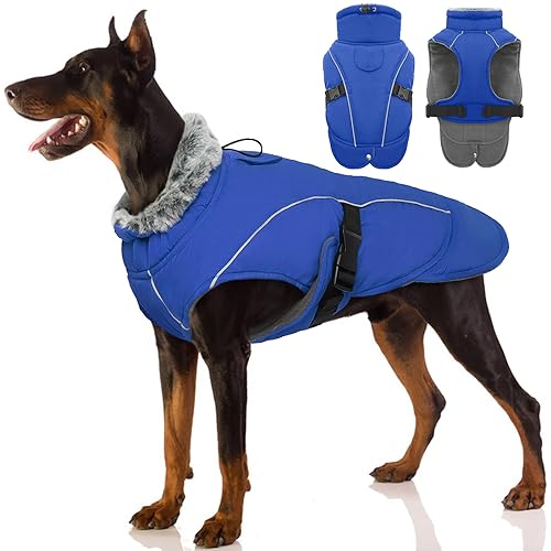 Hundjacka för vintern, vattentätt, varmt hundtäcke, mysig, för hund, valp, kallt väder, väst, snödräkt med pälskrage, vindtät, tjock outfit, fleecefodrade kläder, (blå, storlek L)