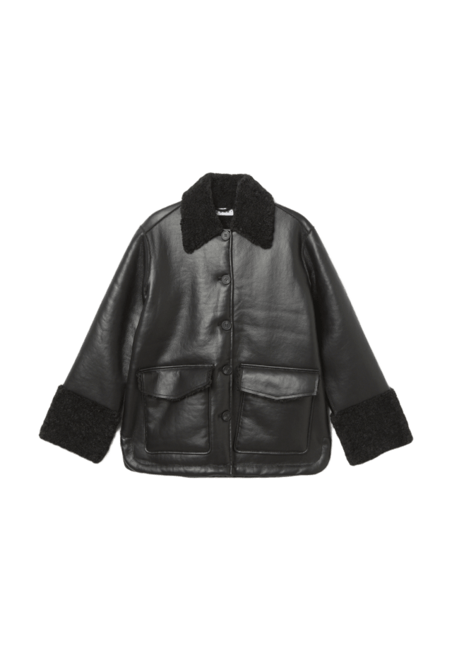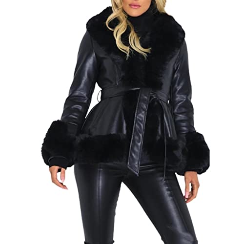 WHZXYDN Fuskpäls PU stor pälskrage slips midja damer vindjacka sömnad smal långärmad jacka kvinnor, Svart, M
