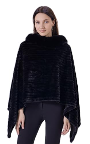 Miaikvs Pullover för kvinnor med stickad sjal och pälskrage, Svart, one size