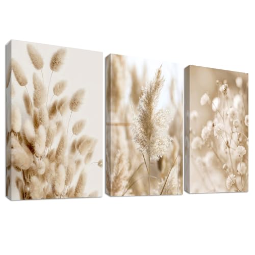 3 st träramade canvasväggkonstverk Boho Nature Beige Pampas Grass Canvas-tryck Botaniska salvia-blommor för vardagsrum, sovrum, hall, trappa, väggdekoration 150 x 70 cm (20” x 28” x 3 st)