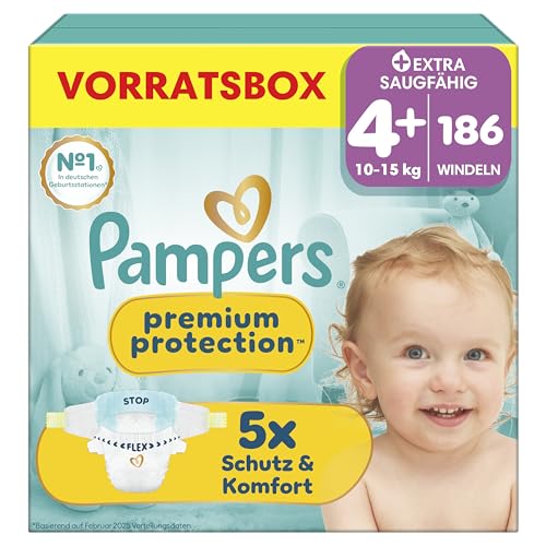 Pampers Premium Protection storlek 4+, 186 blöjor, 10–15 kg, vårt nr 1 hud- och läckageskydd