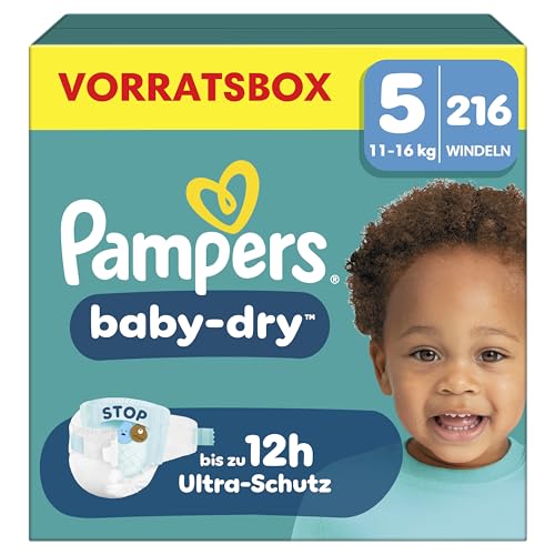 Pampers Baby-Dry storlek 5, 216 blöjor, 11–16 kg, upp till 100% läckageskydd och komfort hela natten