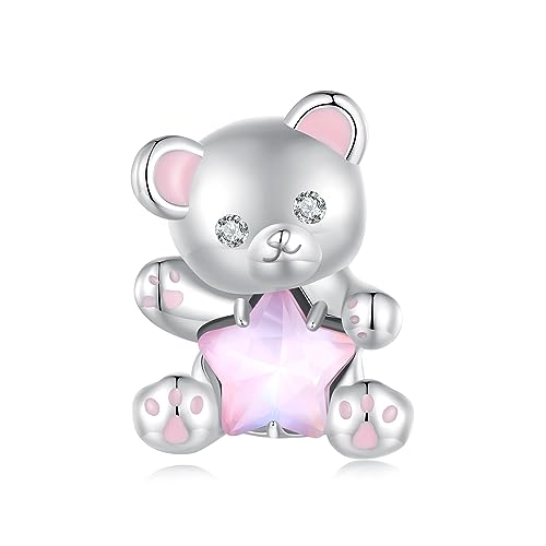 925 sterling silver björn berlock för Pandora armband, rosa stjärnpärlor amulett, gåva för kvinnor och flickor., Kubisk zirkonia, Kubisk zirkonia