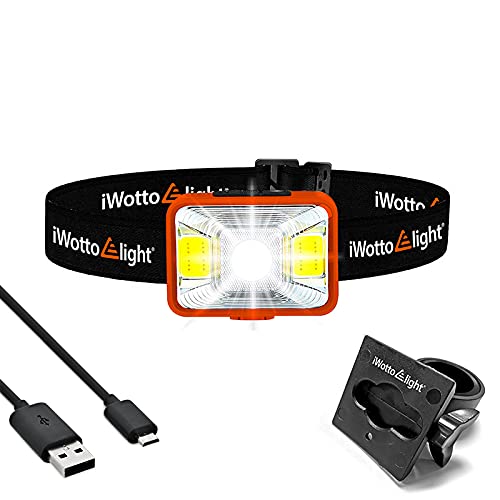 iWotto E light USB-uppladdningsbar LED-strålkastare med justerbart pannband och cykelfäste - hög effekt och 5 lägen - vattentät och dammtät - löpning, fiske, cykling, vandring