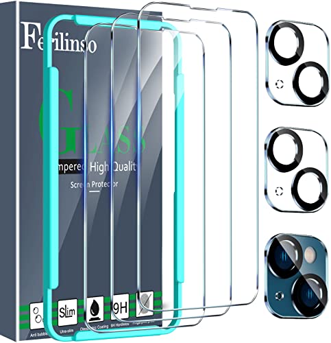 [6-in-1] Ferilinso for Apple iPhone 14 & 13 Screen Protector Accessories 3 Pack 9H Tempered Glass 2 Pack HD Camera Lens Protector Cover Protection Case Friendly mounting Frame protector de pantalla