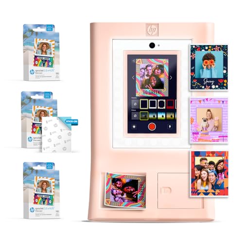 HP Sprocket Photo Booth Machine Instant Color Photo Printer - 10.1" Touchscreen, LED Ring Light - Customize w/250+ Fun Frames, Prints on 3x4 Zink Paper or Share via QR Code, Mobile Notify App -Pink