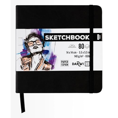 Darwi For You DF80014140001C - Carnet Cousu Sketchbook 14x14 cm 140g - 80 Feuilles Papier Dessin Blanc - Couverture Rigide Noir