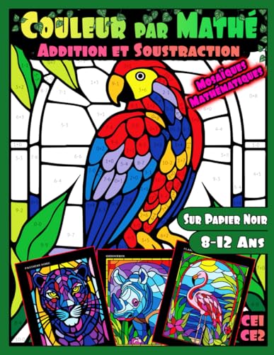 Couleur par Mathé CE1 CE2: Addition et Soustraction Mosaïques Mathématiques: Livre de Coloriage d'animaux par Numéros pour les Enfants âgés de 8 à 12 ans, | Imprimé sur papier noir | Cahier de Calcul