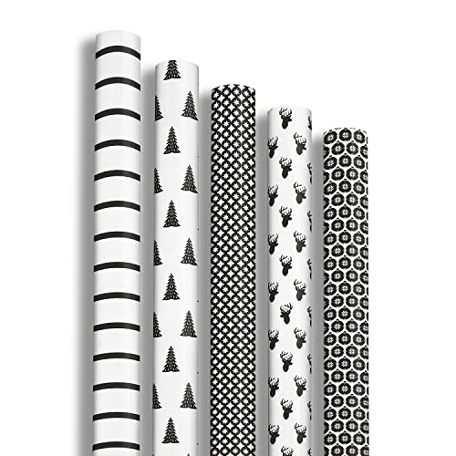 Clairefontaine 211424AMZC - Un Carton De 12 Rouleaux De Papier Cadeau - Papier Excellia 80g - Dimensions : 2x0,70m - Motif : Noël, Noir et Blanc, Sapins, Boules Noël, Cerf - Emballage Cadeau