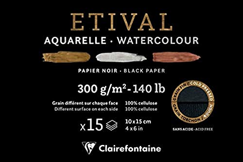 Clairefontaine 975448C - Un bloc encollé 1 côté de papier dessin Etival 15 feuilles 10x15 cm 300g double grains (recto grain fin et verso grain torchon), Noir