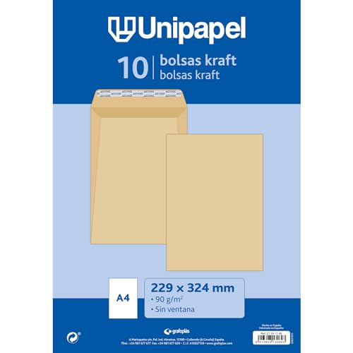 Unipapel | Förpackning 10 x 90 g kraftpapper kuvert | 229 x 324 mm | Rak förslutningsbar påse med självhäftande självhäftande silikonremsa | Toppöppning | Elegant uppåtriktat papper | Perfekt för