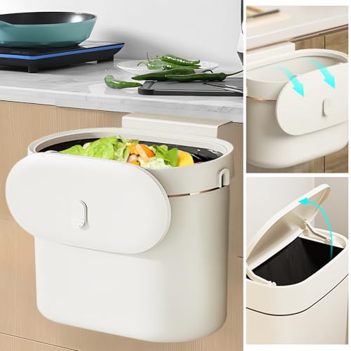Glodeals Papperskorg för kök med lock, 2-i-1 liten soptunna kompostfack, väggmonterad under diskbänken inomhus papperskorg för kök, badrum, skåp papperskorg hängande (4 l, vit/1,05 gal)