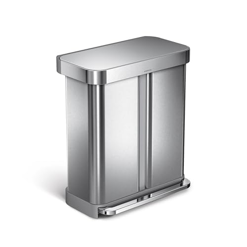 simplehuman 58 liter/15,3 gallon rektangulär handsfree dubbelfack återvinning kök steg papperskorg med mjuk stängningslock, borstat rostfritt stål