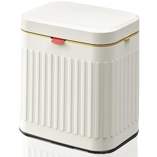 Papperskorg för badrum med lock – ELPHECO vattentät automatisk papperskorg, 2 gallon smal smart papperskorg, 9 L smal rörelsesensor papperskorg för sovrum, badrum, kök, kontor, vit med guldkant
