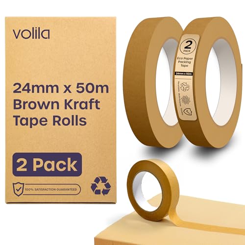 Volila Papperstejp - 2 Pack Bruna Krafttejprullar - Tung Pappersförpackningstejp för Flyttning av Hus, Lådor och Förpackning - Återvinningsbar Papperspaketstejp med Starkt Klister (24mm x 50m)