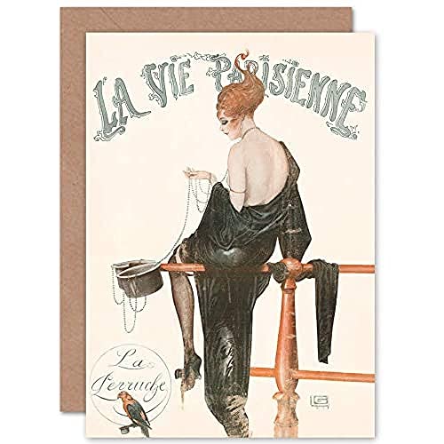 Artery8 La Vie Parisienne kvinna pärlor parakit tidning omslag förseglad gratulationskort plus kuvert tom insida