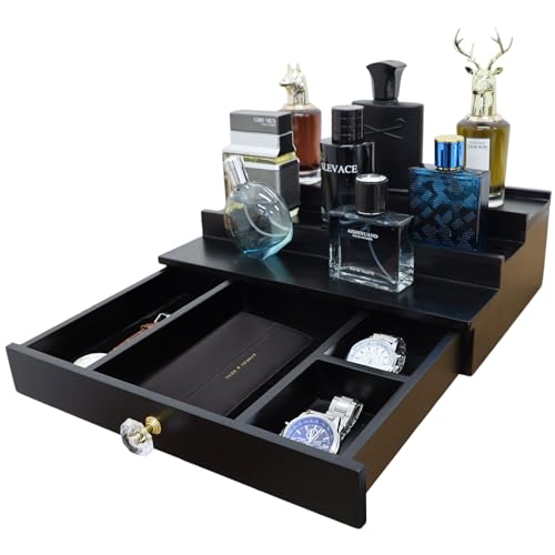 Köln i trä organisatör för män display upphöjare bänkskiva organisering 3 nivåer Cologne stativ med förvaringslåda Cologne hållare Cologne hylla bra gåva parfym byrå organiserare (svart)
