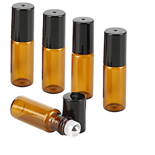 NA 5 ml bärnstensfärgad glasrulle på flaska för eteriska oljor, 5 st parfymflaska med rostfritt stål rullboll, svarta lock mini provflaskor kosmetika liten behållare
