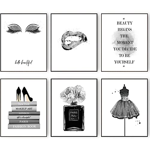 Mode väggdekor flickor rum dekor glam silver grå bling väggkonst tryck mini svart kjol, blomma parfymflaska, bok, läppar och mode motto glitter affischer tryck sovrum dekor (20 x 25 cm ej ramad)