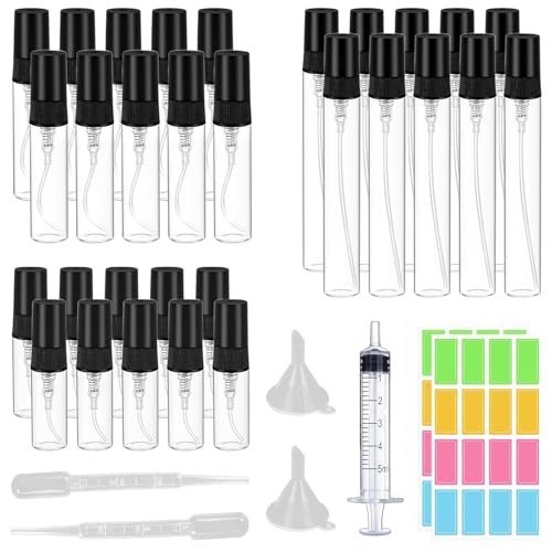GESDYO 30 stycken miniglas parfymsprejflaska bärbar påfyllningsbar mini parfymsprejflaska 3 ml 5 ml 10 ml glas med dekal pipett tratt och pressspruta lämplig för utflykter, parfymflaskor