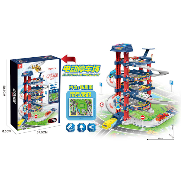 Parkeringsgarage lekset med ljus och ljud – lekmatta och leksaksbilar ingår
