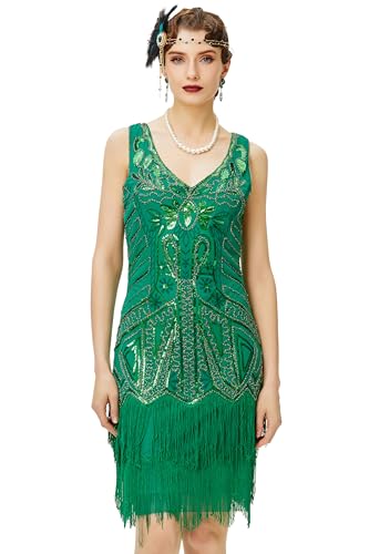 BABEYOND damflapperklänning, 1920-tal, V-ringad med pärlbroderi och fransar, Great Gatsby-inspirerad, gRÖN, X-S