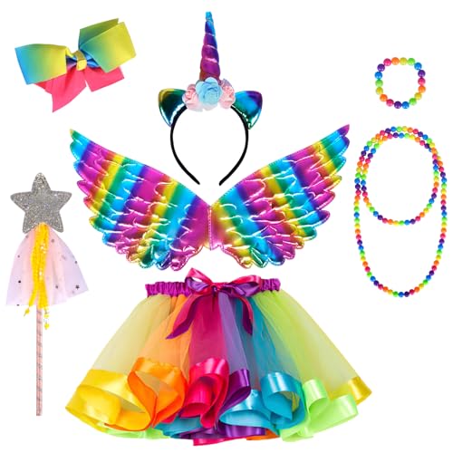 AOUVT 7 delar kjol med enhörningsbyst för barn, halsband med färgade pärlor, armband, trollstav, flickklänningar, festklänning med enhörning, prinsessklänning med enhörning, lämplig för flickor 3 till