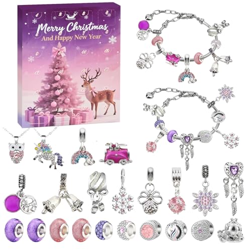 lompyeu Adventskalender för barn, julkalender med smycken för pyssel för flickor, med 20 pärlor, 2 armband och 2 halsband, julklappar till flickor på 6–12 år (rosa och lila)