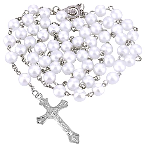 Nazareth Store vita pärlor radband rosor mysterium pärlor bön halsband vår ros Lourdes medalj och kors krucifix, zink, 50 cm, Glas, Ingen ädelsten