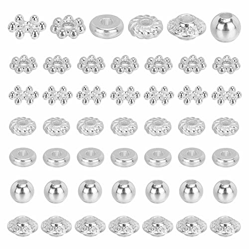 PH PandaHall 6 stil 300 stycken Spacer pärlor silver metallpärlor platt rund snöflinga rund Bicone små lösa pärlor för armband halsband örhänge smyckestillverkning tillbehör