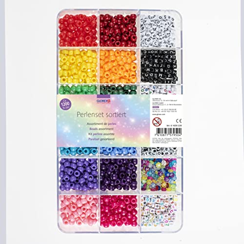GLOREX 6 1630 220 – plastpärlset med olika former och bokstäver, ca 1 200 färgglada pärlor för smyckestillverkning, perfekt för att trä på armband och kedjor