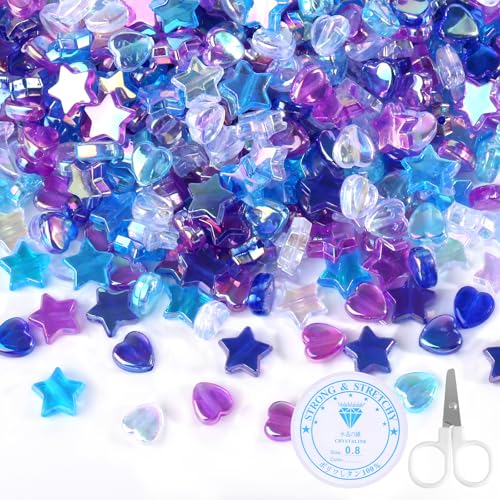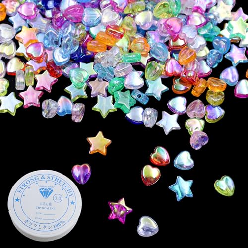 JIANGZHIB 800 stycken hjärtpärlor och stjärnpärlor, akrylstjärnpärlor med 1 rulle 0,8 mm band och en sax, transparenta färgglada pärlor att trä upp, pysselpärlor för att trä på halsband armband