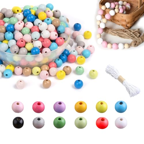 Strehknewen 400 stycken träpärlor för trädning – färgglada träkulor 12 mm med 3 mm trådhål i 12 färger, inkl. 10 m bomullssnöre, pärlor, trä för gör-det-själv smyckestillverkning, armband, halsband