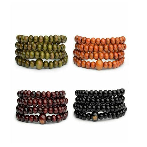 HIQIU 4 stycken Mala-kedja 108 pärlor trä armband set, radband buddhism sandelträ länk handled meditation halsband kedja för män kvinnor, Anpassbar, Sandelträ