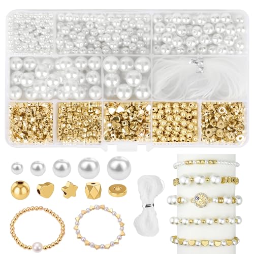1 090 stycken pärlor för att trä upp, glaspärlor, vita konstgjorda pärlor, runda pärlor, vita imitationspärlor guld, avståndspärlor för gör-det-själv halsband, armband, smycken, hantverk (Ø 4, 6, 8