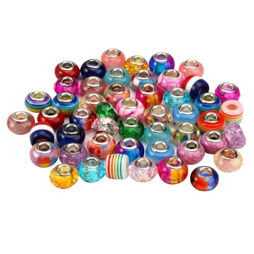 50 stycken färgglada pärlor för att trä upp pärlor med stort hål, runda stora hålspärlor, vintage, konst, glas, blommönster, transparens och färgfyllning för gör-det-själv smyckestillverkning, armband