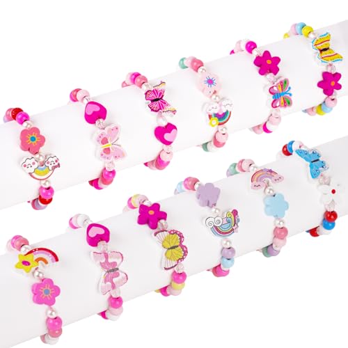AUAUY 12 st trä pärlor flickor armband, fjäril regnbåge design trä pärlor vänskapsarmband för flickor, festpåse fyllning för barnfest, jul födelsedagsfest gåvor, strumpfyllning