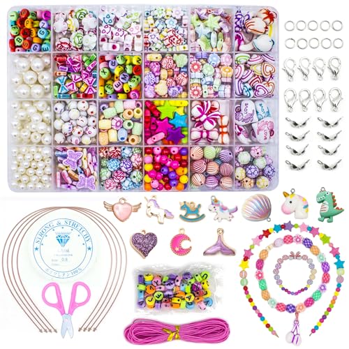 HUMTEOXI Pärlset för gängning, 1 000 stycken pärlor för att trä på barn, färgglatt hänge, sjöjungfrur, pärlor, smycken, halsband, pysselset, gör-det-själv armband, hantverk för flickor