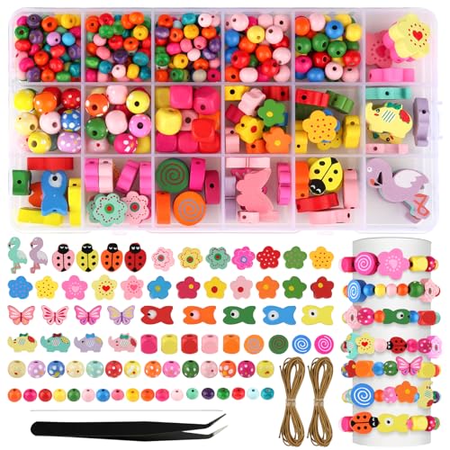 jwogngls 432 stycken färgglada träpärlor, 18-fack gör-det-själv pärlor pysselset hantverk färgglada pärlor att trä på barn träpärlor att trä upp, levereras med nål och tråd