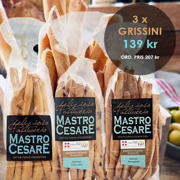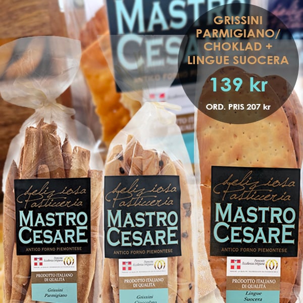 Mastro Cesare tre snacks, Grissini Parmigiano, Grissini Choklad, Lingue Suocera Lök