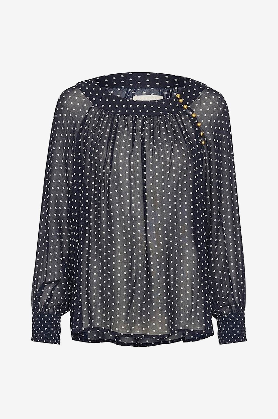 Part Two Dam blus tryckt band krage rund hals avslappnad passform långa ärmar, Svart prickigt tryck, 34