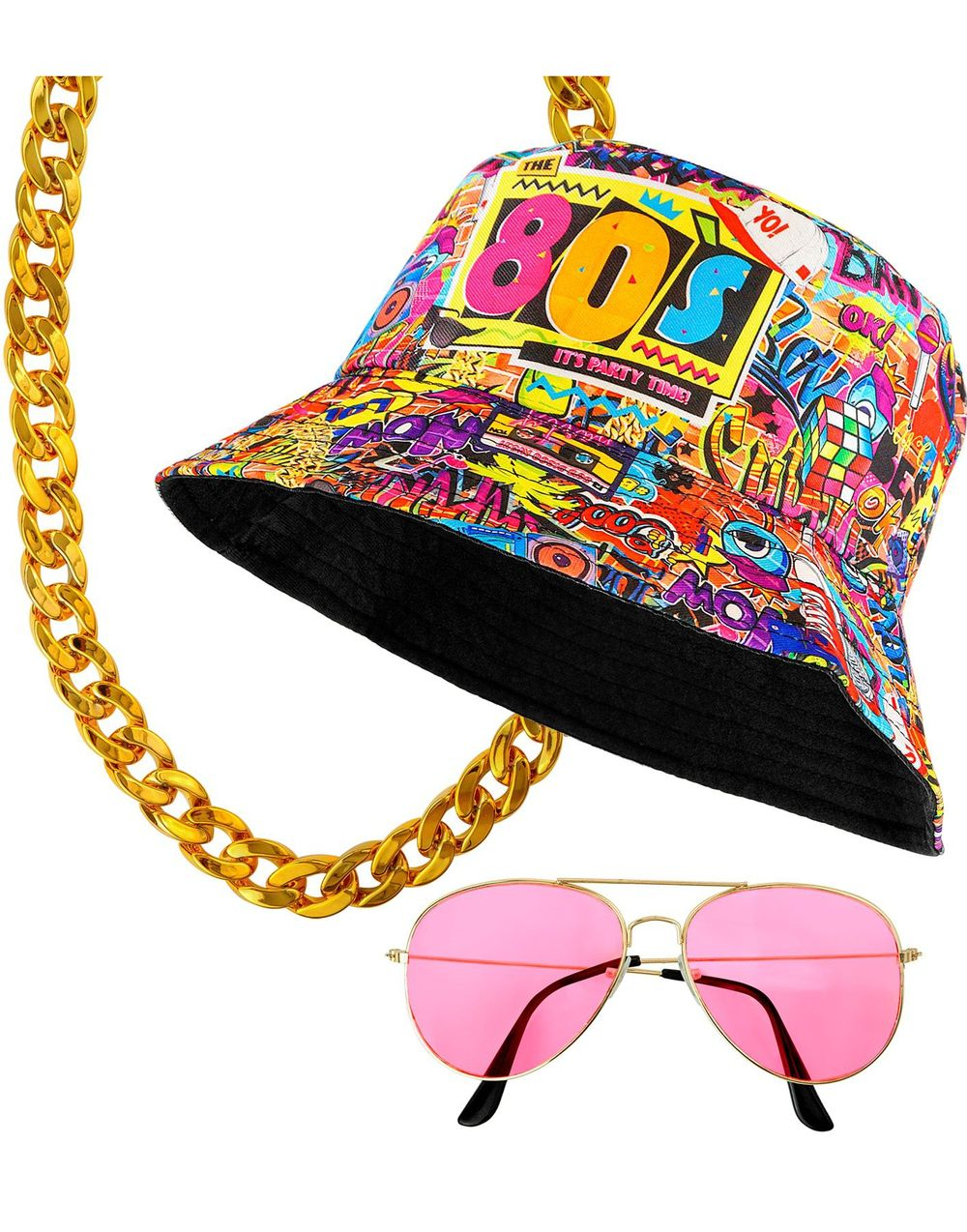 80-tals Party Kit – Bucket-hatt, Guldkedja och Rosa Solglasögon