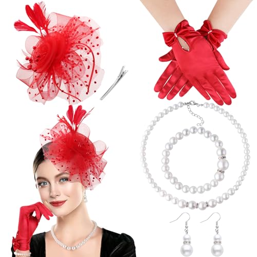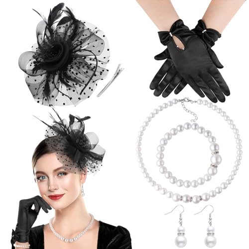 DRESHOW Fascinatorhatt för Kvinnor Slöja Mesh Tea Party Hatt Huvudbonad Fjäder Derby Hatt och Handskar Pärlsmycken för Cocktailer 1920-tals Accessoarset