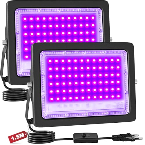 CREATESTAR Pack of 2 UV black light spotlights 100 W, LED black light lamp IP66 waterproof UV floodlight with plug, 385-400 nm floodlight for glow party, bar, disco, blacklight party