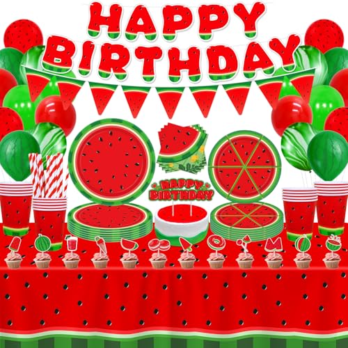 LKITMIUT 164 förpackningar vattenmelon party tillbehör vattenmelon tema dekor en i en melon festdekorationer sommar frukt porslin set – melonplattor, ballonger, banderoller, bordsduk serverad 20
