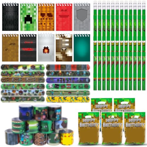 Ezydka Miner videospel party gåva pojke barns födelsedag gåva gåva give away med pennor anteckningsbok nyckelring presentpåsar för födelsedag dekoration, gamer-tema party tillbehör