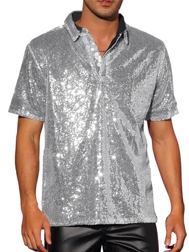 Acrawnni Män gnistrande paljetter skjorta vintage sommar 1/4 gnistrande knapp kortärmad disco toppar 70-talet party klubb nyhet blank skjorta rave toppar, A-silver, L