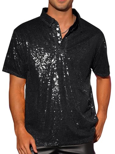 Acrawnni Män gnistrande paljetter skjorta vintage sommar 1/4 gnistrande knapp kortärmad disco toppar 70-talet party klubb nyhet blank skjorta rave toppar, A-svart, XXL